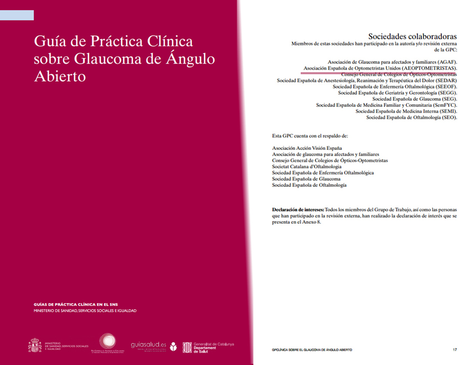 El pasado 31 de marzo 2017; se publicó después de varios años de trabajo la versión completa de La Guía de Práctica Clínica sobre Glaucoma de Ángulo Abierto. Esta guía responde a preguntas clínicas que conciernen a este proceso y se dirige, principalmente, a los profesionales implicados en la asistencia sanitaria de pacientes con glaucoma de ángulo abierto con el objetivo de ofrecerles las herramientas apropiadas de abordaje y tratamiento de esta patología, así como facilitarles la coordinación entre el ámbito de la atención primaria y hospitalaria.