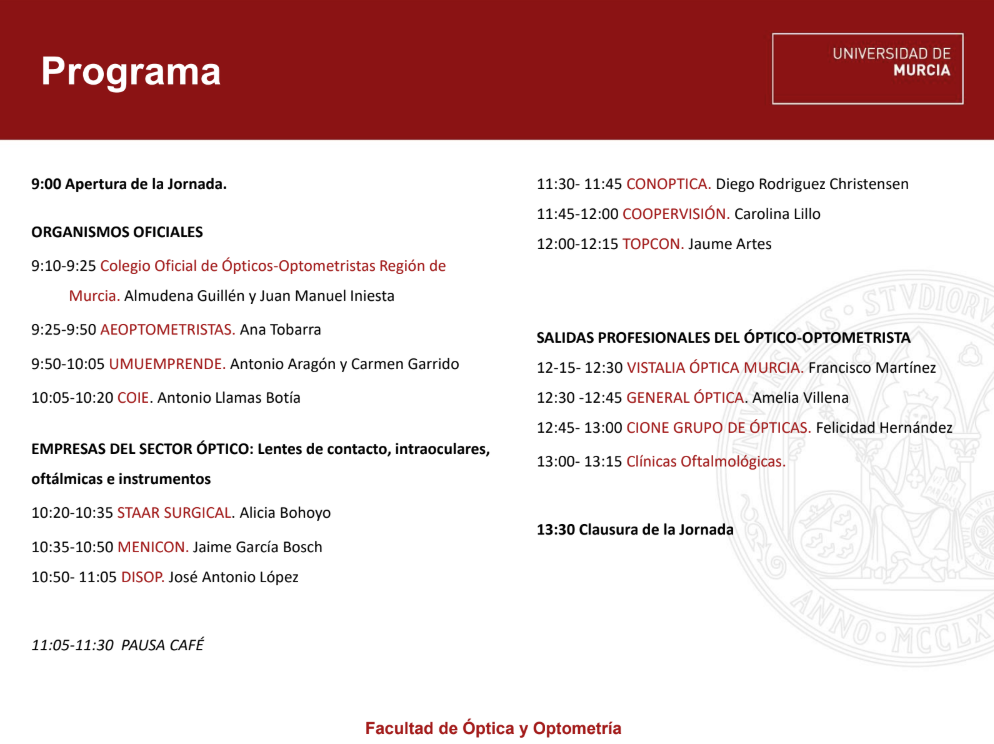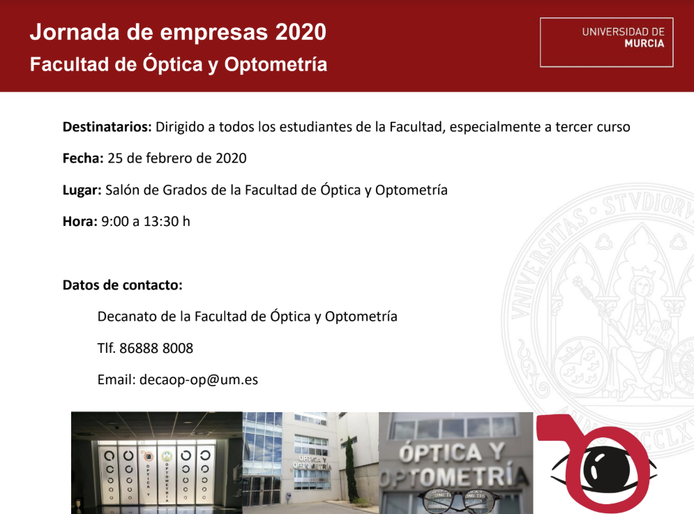 Mañana, nuestra compañera Ana Tobarra, miembro de la Junta Directiva de la Asociación Española de Optometristas Unidos, participará en las Jornadas de Empresa 2020, organizada por la Factultad de Óptica y Optometría en la Universidad de Murcia.